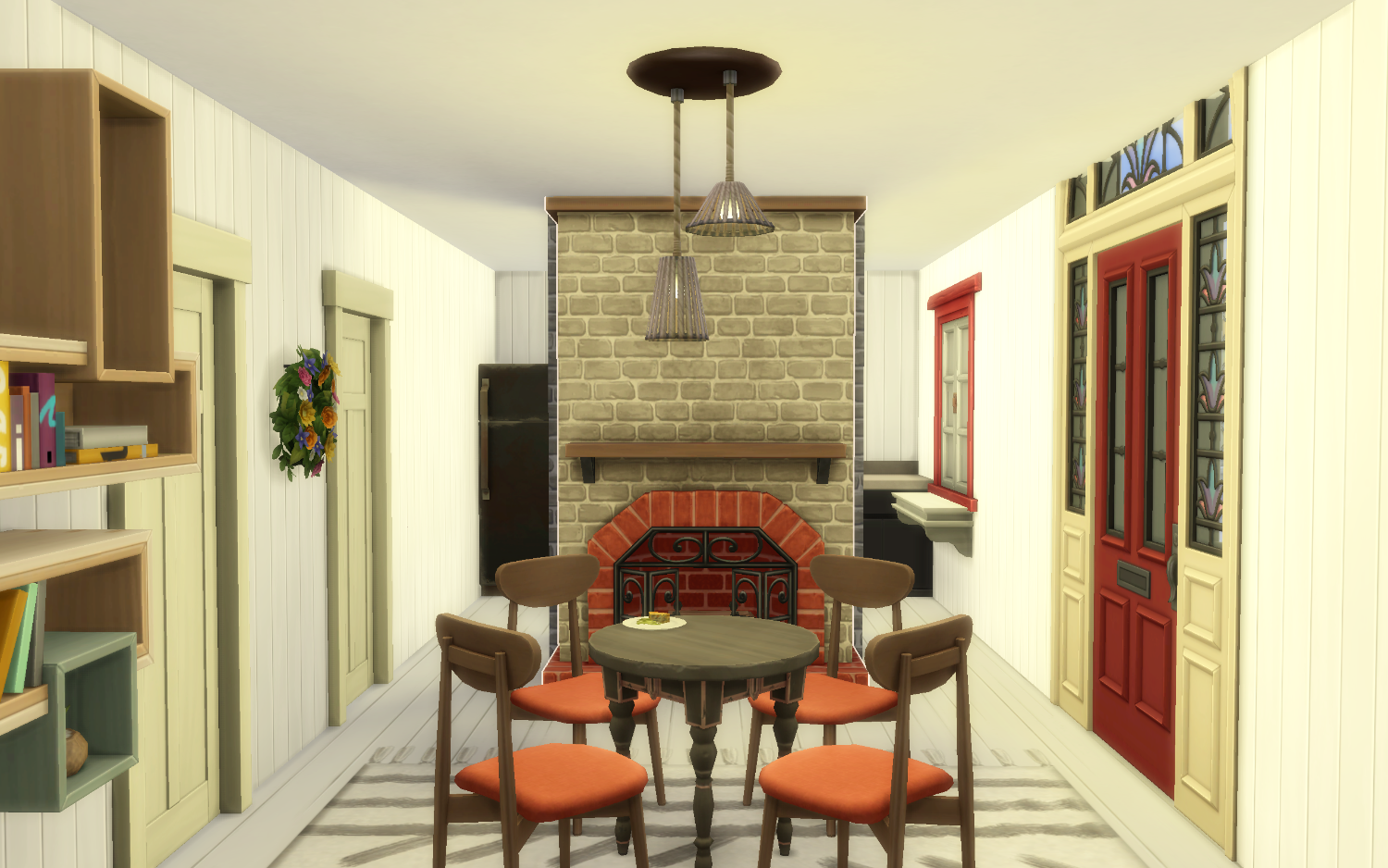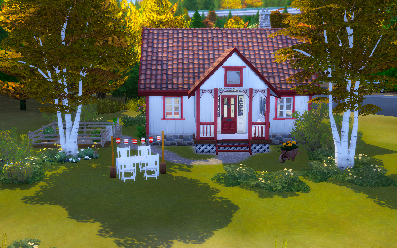 This is a rural Scandinavian starter home. The small house has two bedrooms, one bathroom and a open plan concept for the kitchen and living room. This is divided by a big fireplace. The garden reflects the rural area around. On the garden plot you can grow your own food.